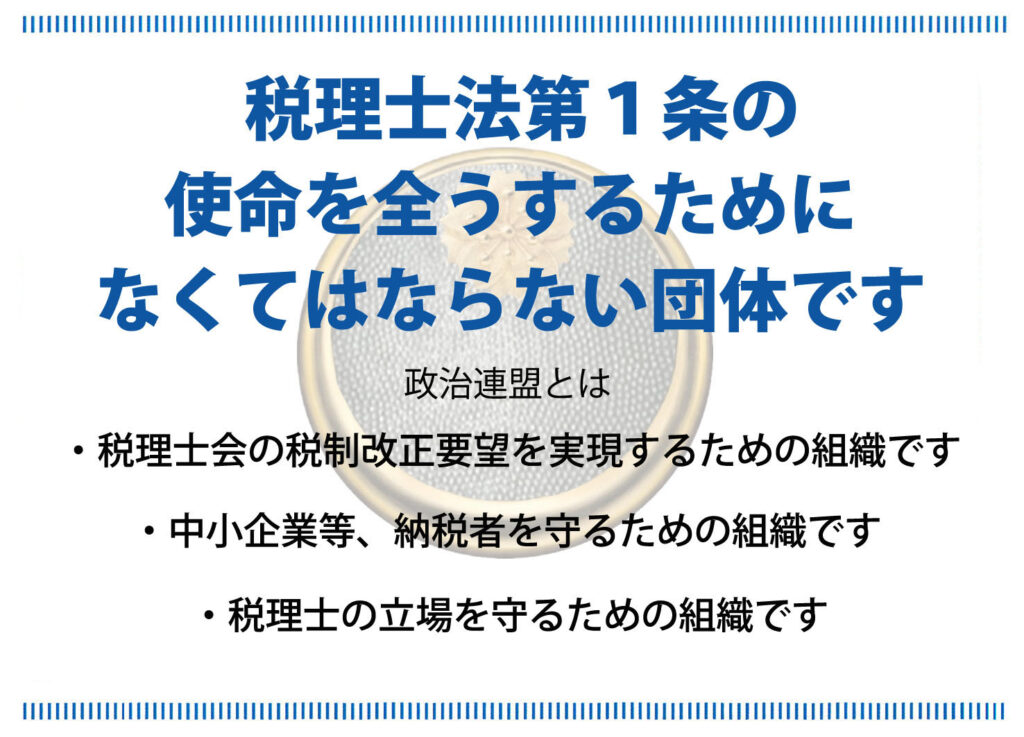 税理士の身分と業務は法律に密接に関係しており、税理士制度を維持し、その拡大・発展を図るには政治力が必要となります。ところが税理士会は特別法人であり政治活動が制限されているので、税政連が税理士会の要望の実現に向けて政治活動をしています。